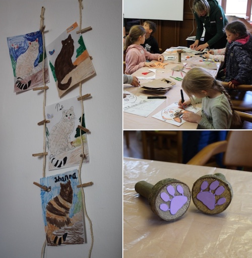 Mit den Naturparkführerinnen, Caroline Neumeister und Susanne Kaiser-Schmitt, gab es zunächst eine kindgerechte Einführung in die Biologie der Wildkatze anhand der Wildkatzenausstellung, die seit dem 4. April im Naturparkzentrum zu sehen ist. Danach wurde so einiges zu Papier gebracht: Wildkatzenmaske basteln, Tüten mit Wildkatzentatzen