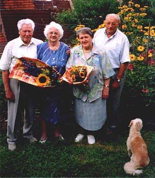 Eine Oase mitten in der Stadt (Foto:privat)(hr) Bereits seit zehn Jahren freut sich Familie Klein aus Gummersbach alljährlich auf ihren Erholungsurlaub in Eberbach. Bei Familie Emmerich in der Neckarstraße verweilten sie nunmehr das siebente Mal, da sie hier zentral wohnen und im Garten hinter dem Haus die Ruhe und vor allem die Aussicht über die Altstadt genießen. Außerdem gibt es allerhand Leckeres an Obst und Gemüse aus dem „Garten Emmerich“. Sofern es die Gesundheit erlaubt wollen Kleins auch im nächsten Jahr nach Eberbach reisen: Sie haben die gemütliche Ferienwohnung bereits für 2003 reserviert. Das Bild zeigt Familie Klein mit ihren Gastgebern Familie Emmerich und ihrem Hund.