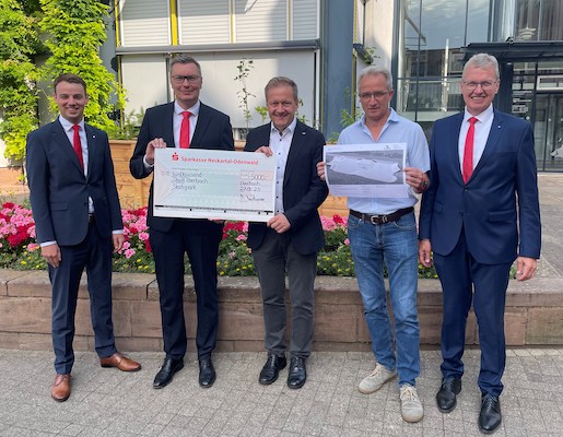 Vor dem Rathaus überreichte der Vorstandsvorsitzende der Sparkasse Neckartal-Odenwald, Sparkassendirektor Michael Krähmer – gemeinsam mit Regionaldirektor Karlheinz Emig und Marktbereichsleiter Simon Court - den Spendenscheck an Bürgermeister Peter Reichert. Die Spende soll dazu beitragen, die Jugendlichen und jungen Erwachsenen der Stadt mit einer modernen Freizeiteinrichtung zu unterstützen und ihnen die Möglichkeit bieten, ihre Skateboard- und BMX-Fähigkeiten weiterzuentwickeln.