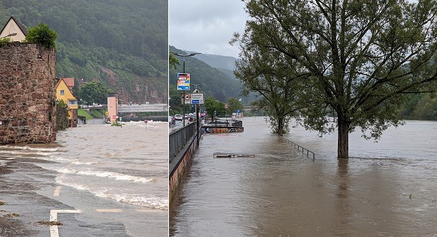 Seit heute Morgen steigt der Wasserstand am Neckar bei Eberbach und Hirschhorn stark an. In Hirschhorn wurde die Uferstraße unterhalb der Stadtmauer überflutet (Bild links), und in Eberbach sind zunächst die Flächen unterhalb der B 37 samt Straßenunterführungen betroffen.