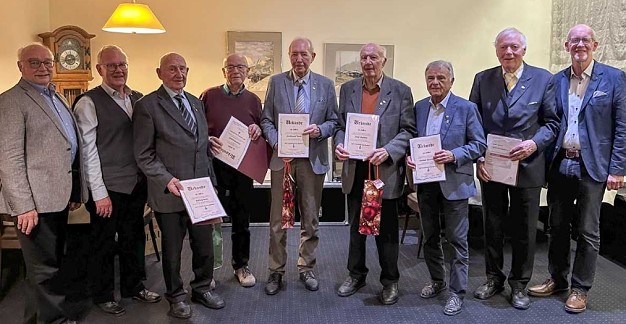 Ehrungsreigen beim weihnachtlichen Familienabend  Für 50 Jahre Mitgliedschaft geehrt wurden: (v.l.) Ludwig Baier, Horst Brenneis, Ferdinand Veith, Josef Mathias, Helmut Deschner, Klaus Gärtner, flankiert von (l.) Dieter Naas (2. Vors.) und Wolfgang Rheinen (Kassier) sowie (r.) Andreas Held (1. Vors.). (Foto: Helmut Höhn)(hr) (ah) Mit weihnachtlichen Klängen, begleitet von Chorleiter Fabio Freund am E-Piano, leitete der Männerchor seinen „Weihnachtlichen Familienabend“ ein. Dieser bildet traditionell den feierlichen Rahmen für die Ehrungen beim MGV Liederkranz Eberbach, und in diesem Jahr stand eine auĂźergewöhnlich groĂźe Zahl an Ehrungen an.