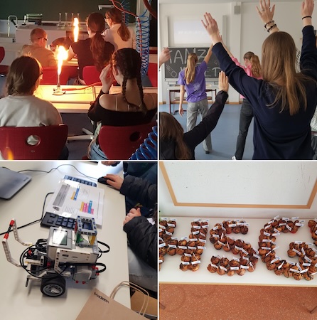 Für die Grundschulkinder wurde parallel ein abwechslungsreiches Programm angeboten. In Begleitung von Schülerpatinnen und -paten erkundeten sie das Schulgebäude und konnten in sechs interaktiven Workshops selbst aktiv werden: Sie führten naturwissenschaftliche Experimente durch, malten Klecksbilder, bauten einen Tornado im Becher, musizierten, sangen und tanzten, bauten Mini-Roboter und entdeckten die englische, französische, lateinische und spanische Sprache.