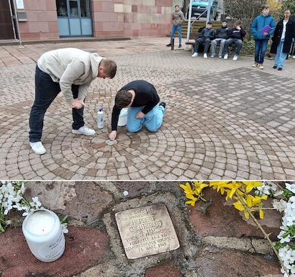 Nach dem musikalischen Einstieg durch Silas Daum mit „Die Rose“ begrüĂźte Schulleiter Bernd Siefert. Rico Meinel und Jason Vogt lasen einen Auszug aus Dirk Strohmengers Buch „Nationalsozialismus im Erbacher Landkreis“ vor. Ăśber die Geschichte Herbert Creuzburgs in der Chronik von Pfarrer May berichteten Elisa Onodje und Noah Hörr. Um die Reinigung des Stolpersteins kümmerten sich Luca Novakovic und Pascal Grünzfelder, während Lea Winterroll und Samia Schönig Kerzen anzündeten. Samuel Onodje und Tim Scior legten Blumen ab.