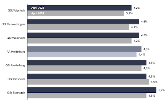 Leichter Anstieg der Arbeitslosigkeit  Die Arbeitslosigkeit im April nach Geschäftsstellen. (Quelle: Agentur für Arbeit) (bro) (aa) Die Arbeitslosigkeit im Bezirk Eberbach ist von März auf April um acht auf 500 Personen gestiegen. Die Arbeitslosenquote betrug im April 5,2 Prozent, vor einem Jahr belief sie sich auf 4,8 Prozent.