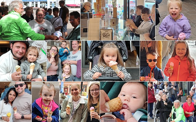 Die ersten rund 150 Eiskugeln waren schnell verteilt, und besonders die vielen Kinderaugen strahlten über die kühle süĂźe Leckerei. Später lieĂź der Andrang zwar etwas nach, aber bis zum Ende der Aktion um 17 Uhr waren alle versprochenen Eisportionen verspeist. Besonders beliebt bei Kindern war das “Troll”-Eis mit einer kleinen Figur als Zugabe. Erwachsene wählten häufig das “Dubai”-Eis mit Schokolade und Pistazien.
