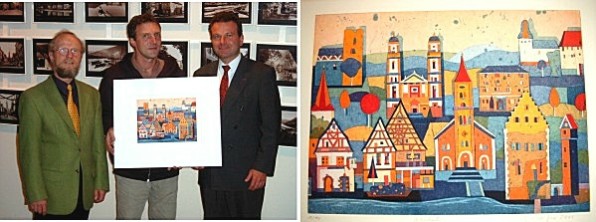 Gerhard Hofmann präsentiert Radierung Eberbacher Motive Kunsthändler Claus Petschmann, Künstler Gerhard Hofmann und Bürgermeister Bernhard Martin mit dem ersten Andruck (Foto:Böhm)(ub) Gerhard Hofmann stellte heute den ersten Andruck seiner neuen farbenfrohen Eberbach-Radierung vor. Im Foyer des Rathauses präsentierte der international anerkannte Künstler zusammen mit Bürgermeister Bernhard Martin im Beisein des Kunsthändlers Claus Petschmann aus Neckargemünd sein neuestes Werk. Das erste Exemplar wird seinen Platz im Eberbacher Heimatmuseum finden. Ab 4. November wird in einer Glasvitrine im Rathausfoyer ein zweites Exemplar der Eberbacher Bevölkerung vorgestellt und kann in limitierter Auflage von 90 Exemplaren bestellt werden. Jedes Exemplar wird vom Künstler nummeriert, bezeichnet und signiert. In den Farben gelb, rot und blau wurden drei Tiefdruckplatten gefertigt, die von der Technik her dem Kupferstich ähnlich sind. Mit Hand- und maschinellen Stichen wird das Bild, ganz in der Tradition der alten Handwerkskunst, handgefärbt und gedruckt. Durch die drei übereinander gelegten Platten wird das Bild beim Druck zum unverwechselbaren Unikat, da sich die Farben individuell darstellen. Das Bildmotiv hat Gerhard Hofmann aus seinem großen Eberbach-Gemälde entwickelt, das die Bürgerstiftung Eberbach erworben hat und im Juni im öffentlichen Raum des Thalheimischen Hauses aufhängen ließ. Es zeigt – im Gegensatz zum Druck - ein komprimiertes Motiv ohne Heißluftballons, in dem der Neckar, die vier Stadttürme und die Kirchen zu sehen sind. Die Graphik wird im Querformat mit einer Bildgröße von 25 mal 34 cm, ohne Passepartout und Rahmen, an die Käufer ausgehändigt. Die bestellten Bilder werden ab 31. Oktober ausgeliefert. Der öffentliche Handel ist in den Vertrieb integriert. Als besonderes Bonbon lädt Kunsthändler Petschmann alle Besteller ein, im Atelier von Gerhard Hofmann dem Druck der Bilder beizuwohnen.