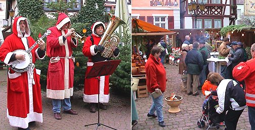 Advent auf Sparflamme (Fotos:Richter)(hr) Unter Besuchermangel litt heute der Adventsmarkt in Eberbach. Auf dem Thonon-Platz am Pulverturm, auf dem Alten Markt und in der Kellereistraße hatten Vereine, Organisationen, Händler und Privatleute ihre Stände aufgebaut und boten allerlei Weihnachtliches an. Aber zwischen den Buden herrschte weitgehende Leere. Zur Unterhaltung zogen jazzende Nikoläuse durch die Gassen, und der Pleutersbacher Björn Schmitt kutschierte als Weihnachtsmann seine Fahrgäste per Pferdegespann durch die Stadt. Die Kurrendesänger sammelten mit ihren Liedern für einen guten Zweck.