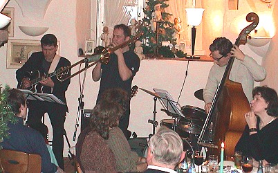 Mit weichen Posaunentönen fing es meistens an, elegisch, apart. Dann setzte Matthias Daneck am Schlagzeug ein, und mit dem aufkommenden Rhythmus gewann das Ganze an Dynamik. Kletterte die Posaune in die Höhe, klang sie eloquent wie ein Flügelhorn. Sperrfechters elektroakustische "Gibson" begann zu swingen, darunter platzierte Arne Huber sein wohl dosiertes Kontrabass-Grounding. Als echtes Nachwuchstalent hatte er keinerlei Probleme, sich in das Spiel seiner Festival-gestählten Kollegen einzureihen. Das Klangbild des Ensembles konnte durchsichtig und unkompliziert sein, als wollte es den Gästen die unerträgliche Leichtigkeit des Seins versüßen, doch atmosphärische Verdichtungen ins Meditative, schwebende Posaunentöne und eine insgesamt recht europäisch noble Art des Zusammenspiels bürgten für gute Unterhaltung auf respektablem Niveau. Neben Ohrwürmern, wie "Alone2Gether" aus der Werkstatt Sperrfechter/Mayer-Mendez, standen Titel von Cousin Ludwig, so eine Eloge auf das Badhaus, the "Small Hotel". Gastgeber Charly bedankte sich mit einem Chanson von Yves Montand. "Les feuilles mortes" passten in den Spätherbst und das Publikum ließ sich verzaubern. Doch irgendwann hieß es Abschied nehmen. Am 7. Januar wird es dann wieder spannend: Die Sängerin Silke Unterspann und ein guter Bekannter, Drummer Erwin Ditzner, haben sich angemeldet.