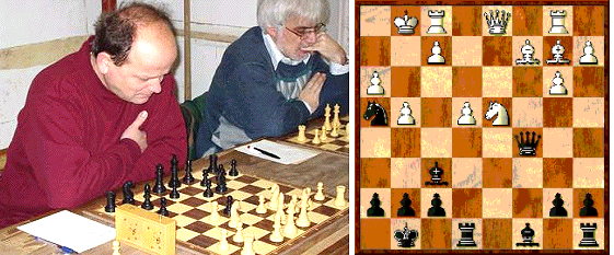 Der SCE gewinnt in einem spannenden Finish G. Wilm (li.) und Udo Lanz; G.Fischer-Wolf: Fischer zog hier die Dame nach d3. Schwarz tauscht dann den Läufer gegen den weißen Springer auf d4. Egal, wie Weiß zurücknimmt: Schwarz schlägt mit der Dame und bietet dann mit dem Springer auf f3 Schach nebst Schlagen auf d4.(Foto/Grafik:privat)(jc) (ds)Mit einem äußerst knappen 4,5 : 3,5 gewann am Sonntag der Schachclub Eberbach I sein Heimspiel gegen die SF Botwinnik Steinsfurt. Einmal mehr zeigte sich dabei der Schach-