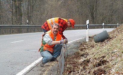 Krötenzäune in Eberbach aufgestellt BUND-Vorsitzender Dr. Harald Grote mit einem Helfer beim Krötenzaunbau im Ittertal. (Foto:Hahl)
