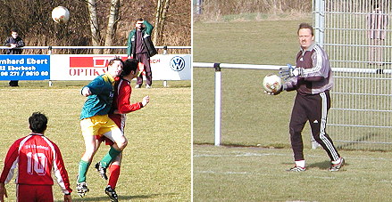 Hiziroglu schwer verletzt - Vorsitzender zwischen dem Pfosten Auch mit viel Einsatz und dem Vorsitzenden im Tor konnte die klare Niederlage nicht verhindert werden (Fotos:Claussen)(jc) (ag)Der SVE Eberbach hatte sich gegen den Tabellenführer DJK Balzfeld nach der Winterpause viel vorgenommen, kam aber letztlich nicht zu dem gewünschten Erfolg. Durch individuelle Abwehrfehler kamen die Gäste zu den entscheidenden Torerfolgen und nahmen verdient die Punkte mit nach Hause. Nach einem angeschnittenen Eckstoß in der 15. Spielminute wurde der Ball zu kurz abgewehrt und konnte aus kurzer Entfernung zum 0:1 im SVE- Tor untergebracht werden.