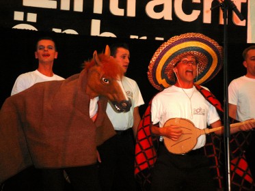 RosaKehlchen begeistern Schönbrunner Publikum Die RosaKehlchen hatten allerlei stimmliche und choreographische Highlights zu bieten. (Foto:Böhm)(ub) Zu einer Begegnung der ganz besonderen Art geriet das Konzert des Heidelberger Schwulenchors "RosaKehlchen" am Sonntag Abend in Schönbrunn. Als krönender Abschluss der Jubiläumsfeierlichkeiten des MGV Schönbrunn begeisterten die 20 Sänger das Publikum im bis auf den letzten Platz besetzten Festzelt. Und wie es für die Gemeinde im Kleinen Odenwald eine mit durchaus gemischten Gefühlen erwartete Premiere war, betraten auch die "RosaKehlchen" Neuland, denn es war ihr erster Auftritt in einem Festzelt. Die Gruppe gibt es seit elf Jahren und sie gastieren zwischenzeitlich von Heidelberg bis Berlin. In der Region wurden sie im Jahr 2000 mit einem Gerichtsurteil bekannt, mit dem sie den Beitritt zum Badischen Sängerbund erwirkten.