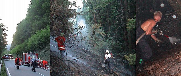 Personen auf dem Hunde-Trainingsplatz im Ittertal meldeten gegen 19.30 Uhr Rauchentwicklung im Wald oberhalb des Itter-Stausees. Mehrere Abteilungen der Freiwilligen Feuerwehr Eberbach rückten mit insgesamt rund 90 Helfern aus. Die Wehrleute fanden das Stromkabel am Boden liegend vor - vermutlich war es durch einen umstürzenden Baum gekappt worden. Es hatte sich bereits ein Bodenfeuer entwickelt, das aber schnell mit Löschwasser eingedämmt wurde, bevor es die Fichten oberhalb der Stromleitung in Brand setzen konnte. Es verbrannten rund 2000 Quadratmeter städtischer Waldfläche. Am Waldbestand selbst entstand nach ersten Schätzungen der Forstverwaltung nur geringer Schaden. Aufgrund der trockenen Witterung und immer wieder aufflammender Glutnester in Holz und Boden dauerten die Löscharbeiten bis in die Nacht an. Die L 2311 zwischen Eberbach und Gaimühle wurde voll gesperrt. Eine Brandwache der Feuerwehr behielt die Waldfläche bis in den frühen Morgen im Auge.