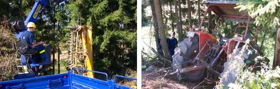 THW birgt landwirtschaftliches Zugfahrzeug auf Abwegen Das linke Bild zeigt THW-Kranführer Karl Lanik beim Herausziehen der Sämaschine. Das rechte Bild zeigt das Zugfahrzeug in einem abschüssigen Waldstück. (Fotos:THW)(bm) (as) Im Anschluss an das Sprengen des Felsens am Itterberg wurden am 20.September drei Helfer des THW OV Eberbach vom OV Neunkirchen mit dem Kranwagen zu Hilfe gerufen. Auf einem Acker in der Nähe von Neunkirchen war ein landwirtschaftliches Zugfahrzeug mit aufgesetzter Sähmaschine in ein abschüssiges Waldstück gefahren. Der Landwirt war zu diesen Zeitpunkt nicht auf dem Zugfahrzeug gesessen und blieb daher unverletzt. Nach Begutachtung durch Helfer aus Eberbach und Neunkirchen begann die Bergung. Zunächst wurde die Sämaschine abmontiert und mit Hilfe des Krans geborgen. Anschließend konnte mit einer Seilwinde die Zugmaschine rückwärts aus dem Waldstück gezogen werden. An der Sämaschine entstand vermutlich Totalschaden. Sie wurde mit dem Kranwagen auf den Hof des Landwirts transportiert.