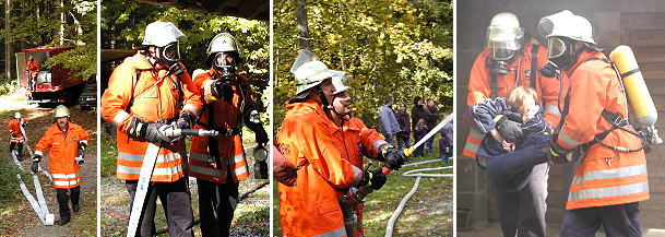 (jc) Heute fand in Friedrichsdorf die Jahreshauptübung der Freiwilligen Feuerwehr statt. Dabei waren 24 Mann aus Friedrichsdorf und sechs Mann aus Eberbach samt Schlauchcontainer im Einsatz. Traditionell waren auch die hessischen Kollegen aus Kailbach, diesmal mit 12 Einsatzkräften, zur Stelle. Mit insgesamt sechs Feuerwehrfahrzeugen waren die Feuerwehrleute ausgerückt, um den Brand der Jagdhütte des Staatlichen Forstamtes im Waldgebiet südlich des Unterdorfs zu bekämpfen. Dabei stellten Menschenrettung aus dem Gebäude, sowie der Aufbau einer Löschwasserversorgung aus einem Unterflurhydranten im Tiefklingenweg und aus der etwa einen Kilometer entfernten Itter die Hauptübungsziele dar. Dabei mussten neben der großen Entfernung auch noch 110 Höhenmeter von der Itter bis zur Jagdhütte überwunden werden. Disco-Nebel sorgte für realistische Bedingungen am "brennenden" Übungsobjekt. Unter den Augen von Unterkreisführer Jürgen Sigmund, Gesamtkommandant Jörg Kubein sowie dessen Stellvertreter und Abteilungskommandant Ralf Böhm klappte die Zusammenarbeit der drei Feuerwehren reibungslos. Lediglich ein geplatzter Schlauch erhöhte die Aufbauzeit für die Wasserversorgung um außerplanmäßige 10 Minuten auf insgesamt 40 Minuten, gerechnet ab Alarmauslösung. Unterstützt wurde die Übung von der Polizei Eberbach, die für die Verkehrssicherung auf der L2311 sorgte, die von der Löschwasserleitung auf freier Strecke gequert werden musste.