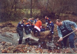 Patenschaftspflege am Naturdenkmal Schwalbenstein Unser Bild zeigt im Vordergrund Thomas Emmerich mit seiner Feuerwehrjugend im Einsatz. (Foto:privat)(tw) (hru) Zu mehreren Arbeitseinsätzen im flächenhaften Naturdenkmal "Schwalbenstein" rückte die Eberbacher Feuerwehrjugend unter ihrem Leiter Thomas Emmerich aus.
