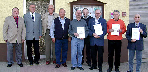 Jahreshauptversammlung bei der Siedlergemeinschaft Strümpfelbrunn Von rechts die geehrten Mitglieder Karl-Heinz Gremmelmaier, Dieter Krieger, Rolf Hagendorn und Günter Gepperth (5.v.r.)zusammen mit dem Mitglied des Landesvorstandes Kurt Baumann (l.), Bürgermeister Klaus Schölch (2.v.l.), Kreisvorsitzender Herbert Wenig (3.v.l.), Gemeinschaftsleiter Reinhold Guckenhan (4.v.l.) und Ortsvorsteher Norbert Bienek (4.v.r.). (Foto:Baumgartner)(tb) Ihre diesjährige Jahreshauptversammlung hielt gestern die Siedlergemeinschaft Strümpfelbrunn im Siedlerheim ab. Auf der Tagesordnung standen dabei auch Neuwahlen und Ehrungen. Gemeinschaftsleiter Reinhold Guckenhan begrüßte dabei die anwesenden Mitglieder der Siedlergemeinschaft, unter ihnen auch Bürgermeister Klaus Schölch, Ortsvorsteher Norbert Bienek, Landesvorstandsmitglied Kurt Baumann, sowie den Kreisvorsitzenden Herbert Wenig. Nach einer Gedenkminute für die im vergangenen Jahr verstorbenen Mitglieder berichtete Schriftführer Jürgern Stötzer in seinem Geschäftsbericht auch über die Aktivitäten des vergangenen Jahres. Höhepunkte seien dabei das Grillfest am Vatertag sowie der Ausflug zum Blumensommer nach Nordheim gewesen. Auch habe man wieder den Skibasar im Sportheim des TSV Strümpfelbrunn ausgerichtet und selbst einen Verkaufsstand beim weihnachtlichen Dorffest unterhalten. Im laufenden Geschäftsjahr habe man zudem sehr viel Zeit in das Siedlerheim und die Gerätschaften investiert. In dieser Woche werde man die Versammlung der Kreisgruppe Mosbach ausrichten und danach auch die Feierlichkeiten zum 600-jährigen Bestehen von Waldkatzenbach unterstützen.