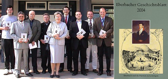 Neuer Jahrgang des ältesten Geschichtsblatts Nordbadens Bürgermeister Bernhard Martin (2.v.r.) und Schriftleiter Dr.Rüdiger Lenz (2.v.l.) mit den Autoren Markus M.Wieland, Dieter Röckel, Helmut Knapp, Christa Haas, Lutz Ritter, Nicolai Knauer und Bruno Schmitt (v.l.). (Foto:C.Richter/Repro:Richter)(hr) (cr) Einblicke in die Stadtgeschichte und ins lokale Zeitgeschehen des vergangenen Jahres bietet das Eberbacher Geschichtsblatt 2004, das heute im Rathaus vorgestellt wurde.