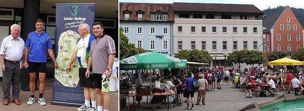 (jc) Die dritte Etappe der Drei-Länder-Radtour ist am Abend in Eberbach zuende gegangen. Gestartet waren die etwa 200 Radler um 9 Uhr in Bad König und fuhren dann die 70 Kilometer über Ebersberg, Beerfelden, Rothenberg und Hirschhorn nach Eberbach, wo sie gegen 18 Uhr eintrafen. Begrüßt wurden sie auf dem Leopoldsplatz von Herrmann Bussemer, als Vertreter des in Urlaub befindlichen Bürgermeisters Bernhard Martin. Für den musikalischen Rahmen sorgte die Eberbacher Jazzcombo. Unter den Tourteilnehmern waren traditionsgemäß Landräte aus den von Tour durchfahrenen Landkreisen. Horst Schnur (Odenwaldkreis), Roland Schwing (Landkreis Miltenberg) und Detlef Piepenburg (Neckar-Odenwaldkreis) traten heute für die in den drei Bundesländern Hessen, Bayern und Baden-Württemberg gelegenen Landkreise in die Pedale. Nach einem gemütlichen Etappenausklang auf dem "Leo" wurden 93 vorab eingebuchte Übernachtungsgäste in der Eberbacher und Hirschhorner Hotellerie untergebracht, ehe am morgigen Sonntag ab 9 Uhr die letzten 70 der insgesamt 303 Kilometer auf den Drahteseln zurückgelegt werden sollen. Die Tour war am Donnerstag in Buchen gestartet und endet morgen am Schlossplatz in Walldürn (wir berichteten bereits).