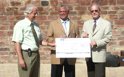 Historische Münzprägung brachte 1050 Euro ein Den Reinerlös von 1050 Euro der Münzprägung bei der 600-Jahrfeier in Waldkatzenbach übergab Marketingleiter Hugo Sablowski (links) zusammen mit dem Vorsitzenden der Volksbank Neckartal, Herbert Hinterschitt (rechts) heute an Bürgermeister Schölch (Mitte). (Foto: Baumgartner)(tb) Im Rahmen der Einweihung des neuen Dorfmittelpunktes in Strümpfelbrunn konnte heute auch ein großer Scheck seinen Besitzer wechseln. Im Vorfeld der 600-Jahrfeier des Ortsteiles Waldkatzenbach hatte Waldbrunns Bürgermeister Klaus Schölch bei der Volksbank Eberbach nachgefragt, ob sie sich am historischen Treiben beteiligen würde. Für die Volksbank war dies eine Ehrensache und entwarf man eine Münze mit dem Abbild der Waldkatzenbacher Kirche. Diese wurde mit einem historischen Fallhammer während der 600-Jahrfeier in Bronze, Silber und Gold geprägt. Den Reinerlös dieser Aktion, insgesamt 1050 Euro konnte Marketingleiter Hugo Sablowski zusammen mit dem Vorsitzenden der Volksbank Neckartal, Herbert Hinterschitt an diesem Tag an Bürgermeister Schölch übergeben. Dieser Betrag soll innerhalb der Gemeinde Waldbrunn für soziale Zwecke verwendet werden.