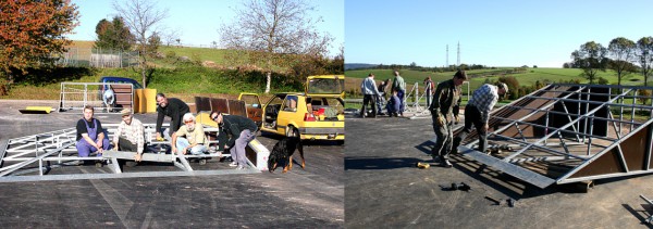 Skateranlage kann ab morgen genutzt werden Die AKA- Mitglieder Norbert Sigmund, Klaus Berberich und Peter Haaß bauen gemeinsam mit Gerry und Richie vom Light-Team die Skateranlage auf. Rottweiler Shira überwacht die Aktion. (Fotos:Böhm)(ub) Nach einer längeren Anlaufphase kann die Schönbrunner Skateranlage ab morgen genutzt werden. Der Vorsitzende des AKA Schönbrunn, Peter Haaß, freut sich über die vielseitige Anlage, die jeder künftig auf eigene Gefahr nutzen kann. Selbst in Eberbach, Meckesheim und sogar Heidelberg, so Haaß, gäbe es nichts vergleichbares. Heute stellte der AKA die Anlage auf dem nahezu 400 Quadratmeter großen Gelände unterhalb des Schönbrunner Tennisclubs auf. Die etwa 1,5 Jahre alte sechsteilige gebrauchte Skateranlage aus Ditzingen, so AKA- Vize Norbert Sigmund, konnte dank der Unterstützung von Sponsoren und der Vorarbeiten durch die Gemeindeverwaltung Schönbrunn heute aufgestellt werden. Die Anlage besteht aus zwei Quarterpipes IV, einer Olly Box I, einer Bank mit Geländer, einer 2/3 Pyramide mit Ledge mit doppelt so großem Table und einer kleinen Rampe. Bei schweißtreibenden Temperaturen wurde heute die Anlage in Zusammenarbeit von AKA, Jugendlichen und dem Light-Team auf dem künftigen Parkgelände zusammengeschraubt. Der AKA möchte die Jugendlichen von vornherein in das Projekt einbinden. Finanziert wurde der Scaterpark mit Hilfe von Sponsorengeldern und dem Erlös aus mehreren Konzerten. Die Kosten für den AKA belaufen sich auf 10.000 Euro, wobei der geschätzte Neuwert bei 27.000 Euro liegt. Für die Anlage habe der AKA eine 10jährige Garantie erhalten. Sichtlich stolz sind die AKA´ ler auch auf das Engagement der Jugendlichen, die - nach der Begrünung- auch die Pflege des Platzes übernehmen sollen. Die offizielle Einweihung mit Bürgermeister, Gemeinderat und Sponsoren ist für Ostern 2005 vorgesehen.