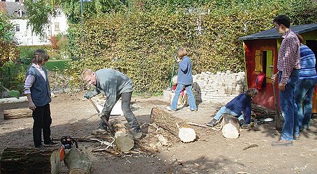 Fleißige Eltern übernahmen Restarbeiten (Foto: privat)(bro) (gb) Nach der Neugestaltung der Außenanlage des Kindergartens Regenbogen in Eberbach (Aktion: "72 Stunden – ohne Kompromiss"- wir berichteten) trafen sich nun an einem Samstag einige Eltern und Kinder des Kigas, um weitere Arbeiten im Außenbereich durchzuführen. Es wurden unter anderem Baumstämme geholt, geschält und zum Klettern und Balancieren verlegt. Für die Verpflegung sorgten die Metzgerei Zorn und der Eberbacher Hof.