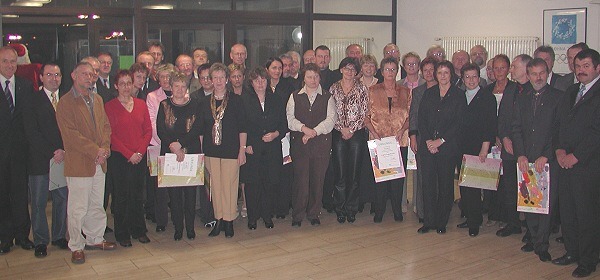 Erfolgreiches Jahr trotz schwieriger Bedingungen -Zahlreiche Mitarbeiter geehrt 58 Mitarbeitende des Schwarzacher Hofes der Johannes-Anstalten Mosbach wurden mit einer Urkunde für 25-jährige treue Dienste geehrt. Das Bild zeigt die Jubilare mit Geschäftsführer Reinhard Adler, den Geschäfts- und Fachbereichsleitern Dr. Alexander Vater, Dr. Peter Rösinger, Dr. Helmut Müller, Rudolf Link und Pfarrer Eckhard Weißenberger. (Foto Legat)(tw) (ap) Bei der traditionellen Weihnachtsfeier des Schwarzacher Hofes der Johannes-Anstalten Mosbach wurden jetzt 58 Mitarbeitende für ihren 25-jährigen engagierten Einsatz geehrt. Mehr als 500 Mitarbeitende nahmen an der Feier in der festlich geschmückten Schwarzach-Halle teil. Geschäftsführer Reinhard Adler hieß besonders herzlich den Schwarzacher Bürgermeister Theo Haaf willkommen.