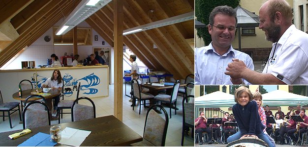 (hr) Sein neues Vereinsdomizil im Dachgeschoss des Nebenbaus der Dr.-Weiß-Schule weihte heute der Fanfarenzug Eberbach mit einem kleinen Sommerfest im Schulhof ein. Die musikalische Umrahmung überließen die Landsknechte diesmal dem befreundeten Spielmannszug der Freiwilligen Feuerwehr Ober-Schönmattenwag, bei dem auch zwei Eberbacher mitspielen.