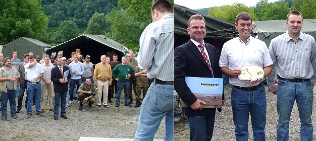 Die sommerlichen Camps der Engländer am Neckar haben eine inzwischen 36-jährige Tradition, die der Eberbacher Familie Rohde zu verdanken ist. Private Bande waren es, die im Jahr 1972 erstmals zu einem Besuch der Soldaten führten, die seitdem in zahlreichen Arbeitseinsätzen während ihrer Aufenthalte viel Gutes für Eberbach getan haben. Auch in diesem Jahr wurden wieder unentgeltlich Hütten gebaut (siehe Video), Tümpel angelegt, Brücken gesichert und Bachufer befestigt. Wie Kompaniechef Phil Houlston erläuterte, seien diese Arbeitseinsätze nicht nur gut für die Allgemeinheit und den Naturschutz, sondern auch willkommene Trainingsmöglichkeiten für die Soldaten, denen im kommenden Jahr wieder ein ernster Einsatz bevorsteht: Im Herbst 2009 soll die Squadron nach Afghanistan verlegt werden. Bürgermeister Bernhard Martin bedankte sich bei Houlston und seinen Männern für die geleisteten Arbeiten. Als Geschenk gab es zum Andenken an Eberbach Vesperbretter im Umriss eines Wildschweins aus Holz. Und weil es für so etwas keinen englischen Begriff gibt, erklärte der Bürgermeister den lachenden Gästen: "This is a Feshperbrett - when you feshper you have a brett".