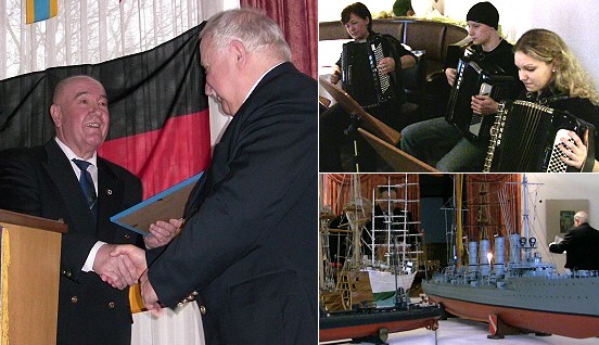 Erich Neuner (l.) ernennt Dieter Jeitner zum Ehrenmitglied. Rechts oben das Akkordeonensemble, unten die Modellausstellung.(Fotos: Hubert Richter)