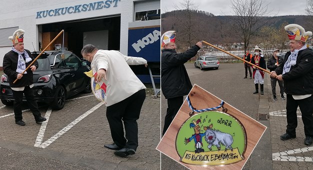 Echte Fastnachter lassen sich auch von einer Pandemie die gute Laune nicht verderben. Und so wurden über Mittag vor dem Vereinsheim “Kuckucksnest” die Orden an Aktive, Beiräte, Elferräte, Ehrensenatorinnen und -senatoren und weitere den Verein besonders unterstützende Kuckucksmitglieder verteilt.