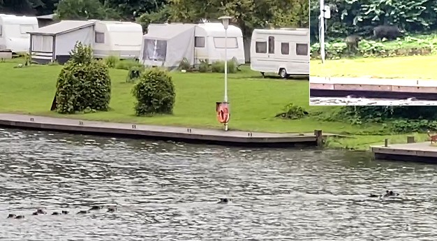 Die rund zwölf Tiere zählende Rotte war wohl gehen 10.30 Uhr am östlichen Flussufer ins Wasser gegangen und schwamm recht zügig in Richtung Yachtclub-Campingplatz. Dort fanden die Schwarzkittel nach einem kurzen Trip an der Kaimauer entlang schnell eine Stelle, an der sie an Land gehen konnten. Im Buschwerk des Campingplatzes suchten die Tiere Deckung, bevor sie sich weiter hangaufwärts trollten.