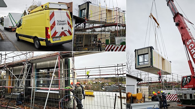 Für die Kinder werden dann rund 135 Quadratmeter Raumfläche zur Verfügung stehen. Der Bau wird aus vier Modulen in Holzbauweise zusammengesetzt. Jedes Modul misst etwa 11 x 3,5 Meter und wiegt gut 20 Tonnen. Nacheinander wurden die Module heute per Schwerlastkran an ihre endgültigen Positionen auf der vorbereiteten Bodenplatte gehievt. Knapp 80 Prozent der Dachfläche des Neubaus sollen mit Photovoltaik-Modulen belegt werden, und der gewonnene Strom ist für den Kindergarten vorgesehen bzw. wird in das Netz eingespeist.